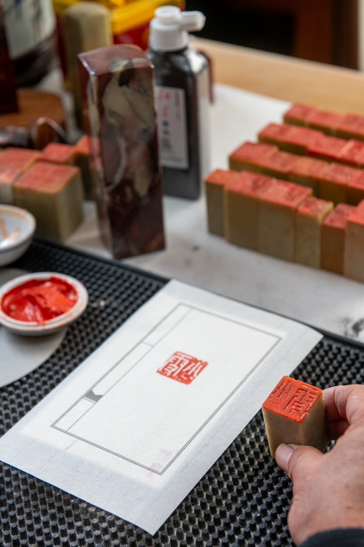 最后是钤印。刻好的印石在朱红印泥上均匀蘸取,而后稳重地压印在纸上。随着手腕抬起,“小雪”二字清晰浮现,为这个节气留下一方宁静的印记。