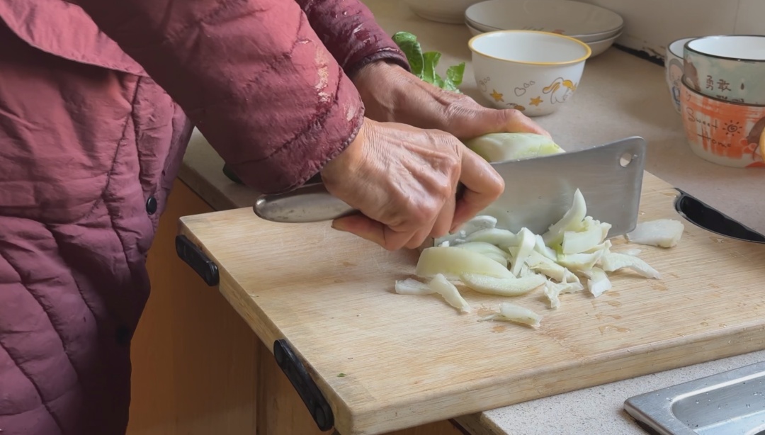 朱阿姨又拿出几瓶此前腌制好的咸菜,切成碎末后,和肉沫、白胡椒粉一起翻炒,顿时香气四溢,一道鲜香下饭的咸菜炒肉丝便热气腾腾地出锅了。朱阿姨回忆道:“过去物资匮乏,蔬菜腌制后要供全年食用。那时咸菜甚至无需烹煮,洗净后直接整块食用。如今这份童年记忆,反而成了最怀念的味道。”