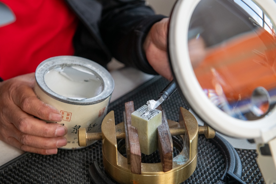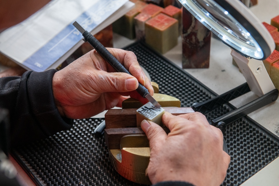 刻制时,印石需固定在印床上,以刻刀沿笔迹镌刻,运用冲刀与切刀,使笔画凹下,此为阴刻。
