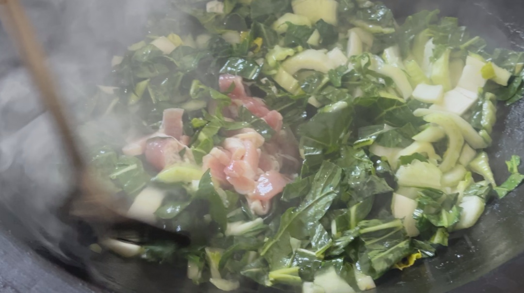 待土灶上的铁锅烧得发烫,周阿姨倒入少许冷油,先把咸肉放进锅里翻炒。随着 “滋滋” 声响,浓郁的肉香味很快四散开来,待咸肉煸出透亮的油花,她利落地将切好的青菜倒入锅中,开大火快速翻炒,青菜的清香瞬间与肉香缠在了一起。