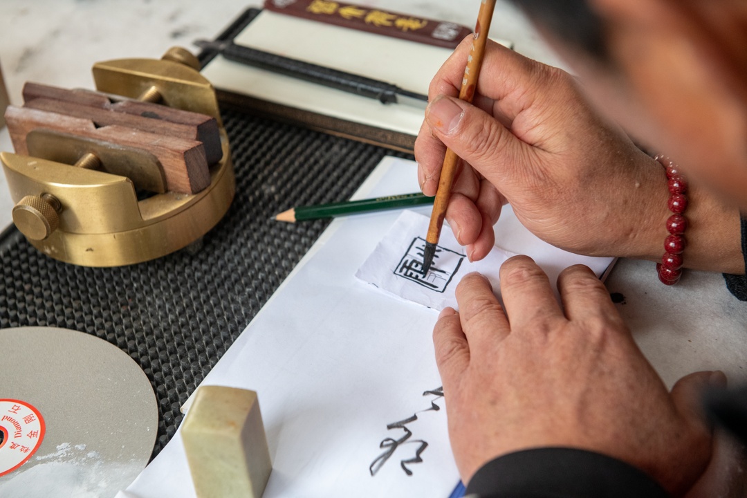 小雪节气,正宜沉心静气,体验一门古老的手艺——篆刻。在漕泾镇金光村,手艺人马老师正在进行篆刻准备工作。准备好刻刀、印石和印床,便可以开始进行篆刻了。一切从“排印”开始,先在纸上规划“小雪”二字的布局,接着用毛笔将字反写,趁墨迹未干时覆纸轻压在印石上,留下清晰的印稿。