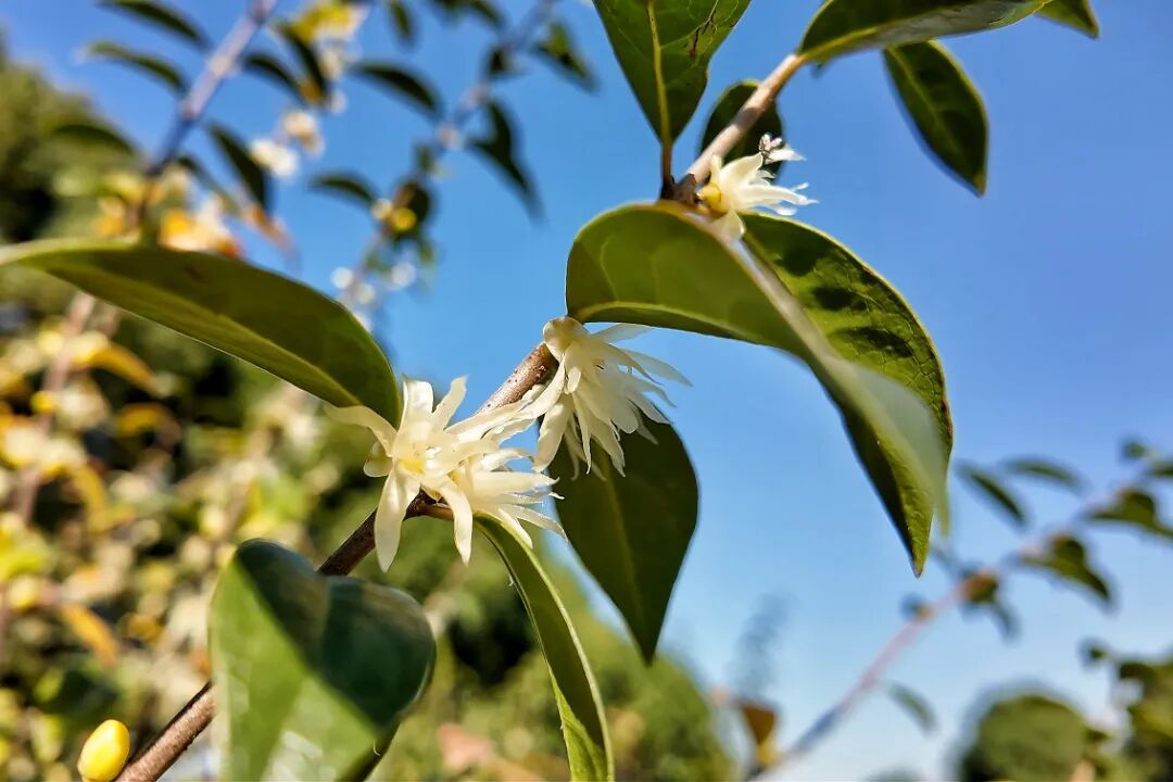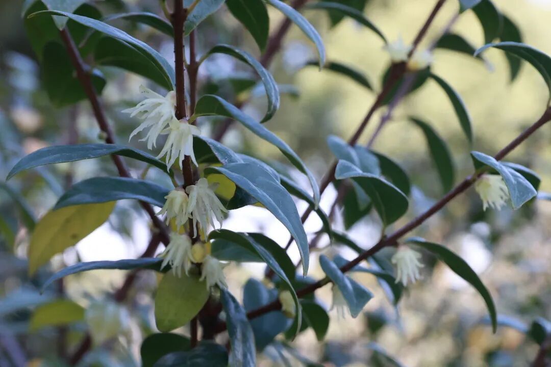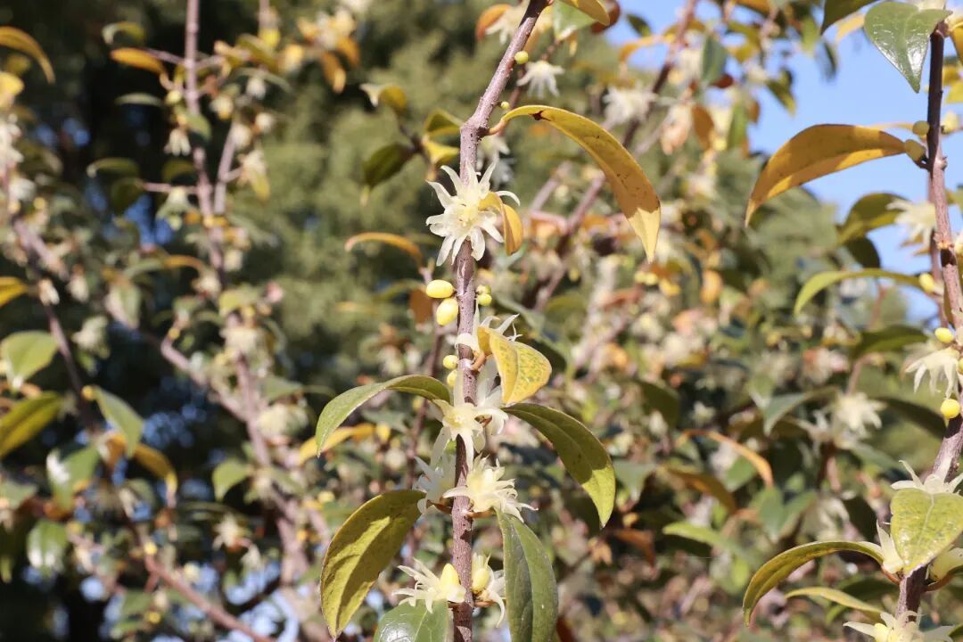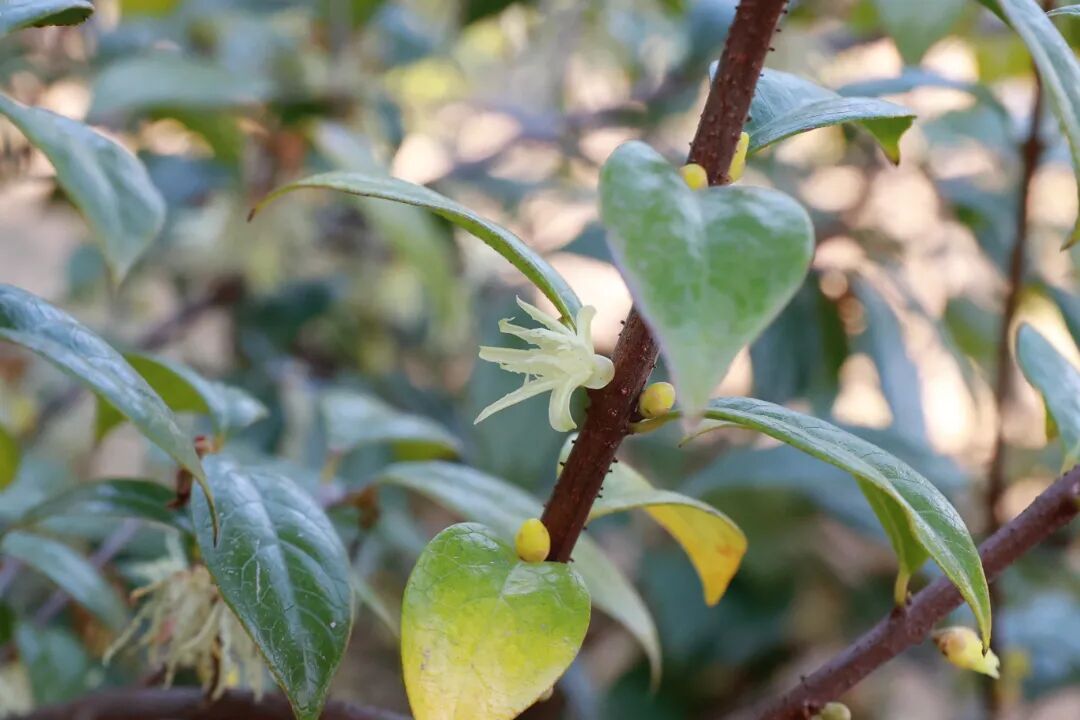 园内的西南蜡梅植株挺拔秀丽,狭长的叶片表面带着细密的纹路,淡黄色的小花虽不张扬,却散发着清幽的香气。与其相邻的柳叶蜡梅则展现出不同的美态,叶片形似垂柳,花朵色泽明黄,在秋日阳光下熠熠生辉。