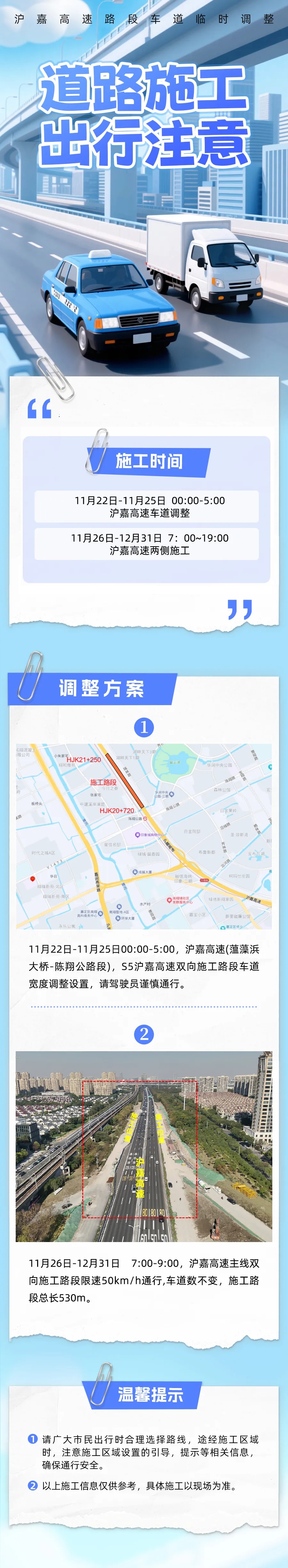 市交通委指挥中心介绍,根据S5沪嘉高速-嘉闵高架联络线新建工程施工2标进度安排,即日起至11月25日将进行沪嘉高速(蕰藻浜桥-陈翔公路段)两侧车道临时调整,并将在11月26日-12月31日,启动路段两侧高架引桥拼宽施工,此次施工为S5沪嘉高速陈翔公路立交段工程的一部分。道路施工过程中,S5沪嘉高速主线双向车道将有所收窄。现将具体交通组织情况通告如下↓