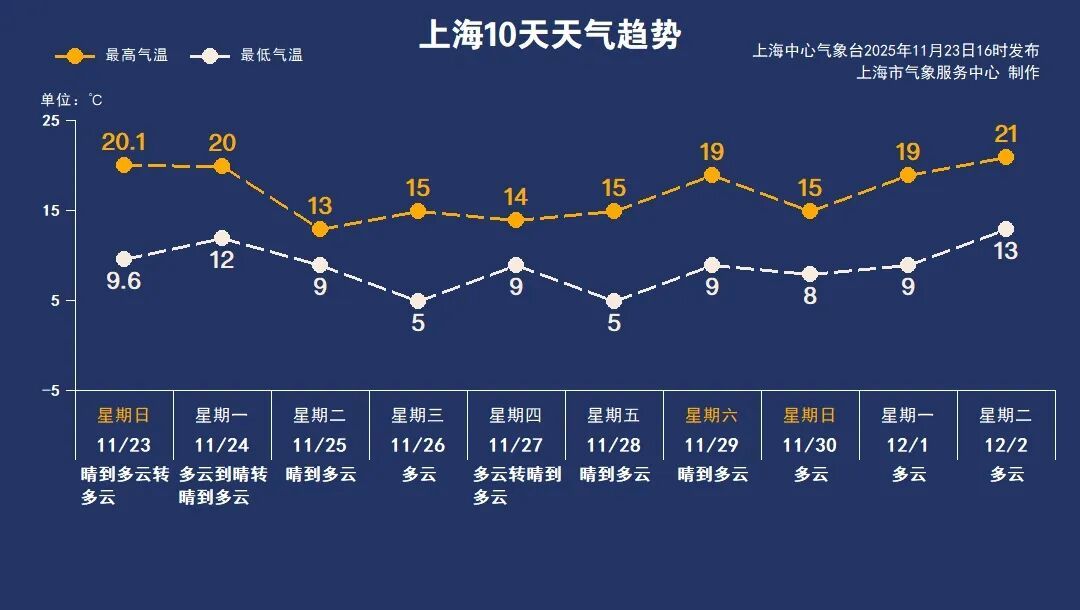 今天最高气温仍可达20℃,受冷空气影响,夜里起气温开始下降。