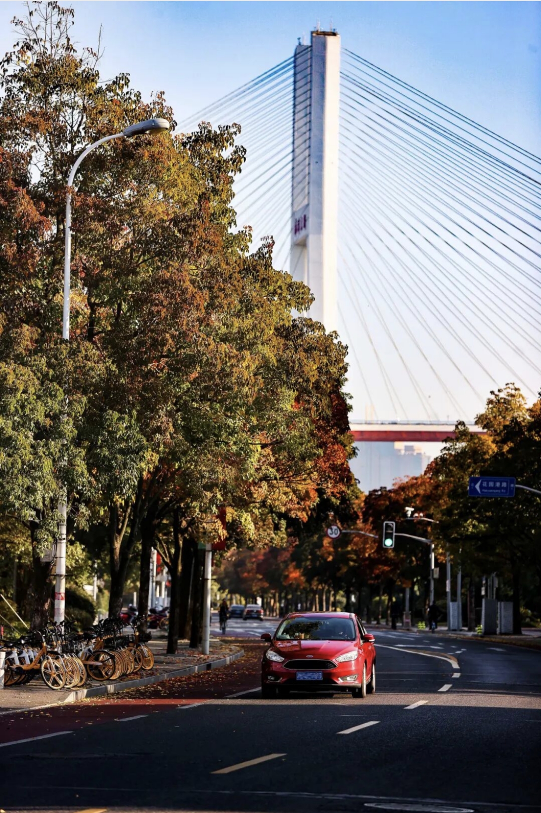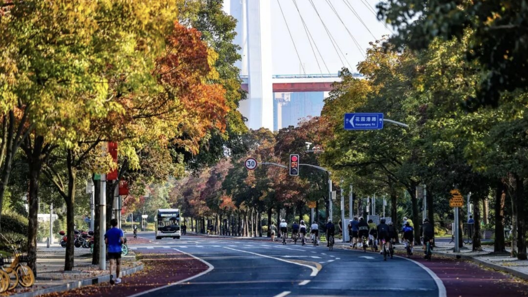 苗江路比邻黄浦江,离南浦大桥也很近,风景宜人。骑行过程中,可以欣赏到黄浦江的壮阔景色,江面上船只穿梭,对岸的高楼大厦林立,构成了一幅美丽的城市天际线。此外,路边还有绿树成荫,特别是到了秋季,栾树黄、银杏金、枫叶红,金黄的秋叶飘落,与红色的骑行道相互映衬,如诗如画。