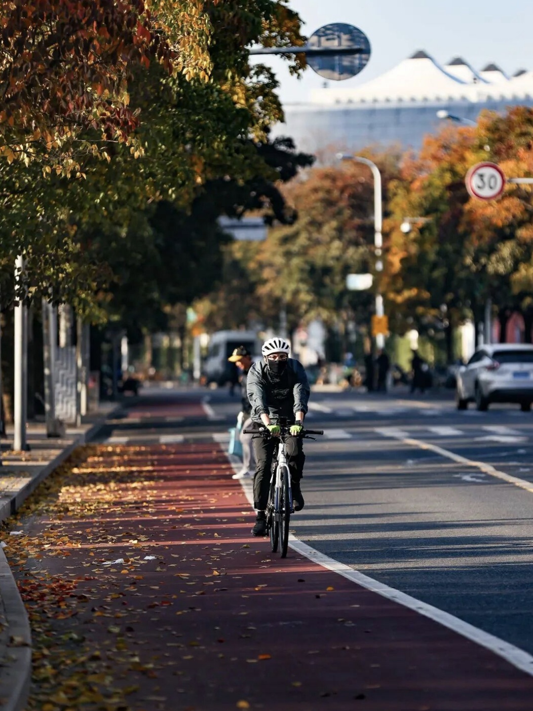 骑行道采用自主研发的低吸热水性纳米环保彩色材料铺设,共三层,防滑效果好。路面上还绘制了非机动车标识、健身标识以及“起点”“500米”“1公里”等里程标识,引导骑行者安全骑行。