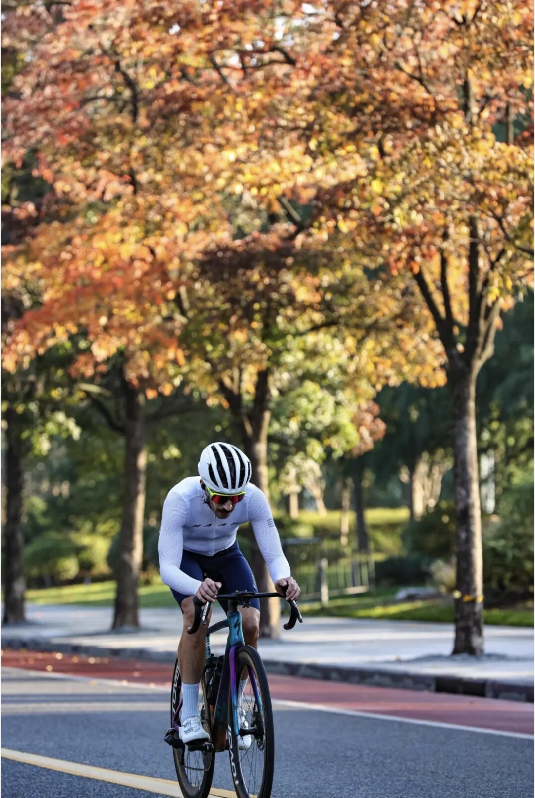 骑行道全长6.25公里,设计立足于原有林带充足的绿量及河道水文资源,宽敞平坦,两侧林荫夹道。