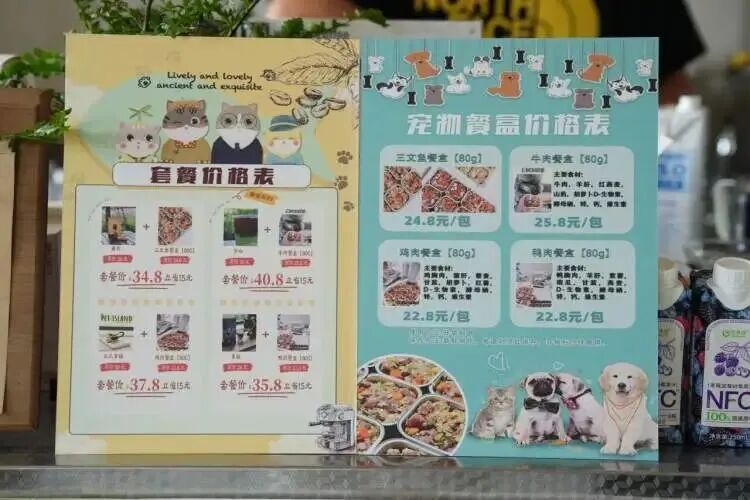 咖啡馆有“萌宠咖啡+鲜食”套餐,主人可以一边看书,一边享用咖啡、饮品,毛孩子相伴一旁,品尝宠物鲜食。