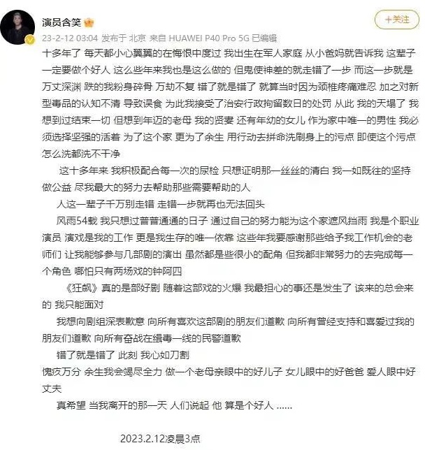 次日(即2023年2月12日),含笑发文道歉,称“错了就是错了,就算当时因为颈椎疼痛难忍,加之对新型毒品的认知不清,导致误食,为此我接受了治安行政拘留数日的处罚。”“我想向剧组深表歉意,向所有喜欢这部剧的朋友们道歉,向所有曾经支持和喜爱过我的朋友们道歉,向所有奋战在缉毒一线的民警道歉。”“错了就是错了,此刻,我心如刀割。”