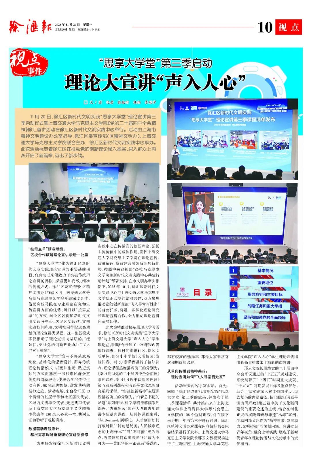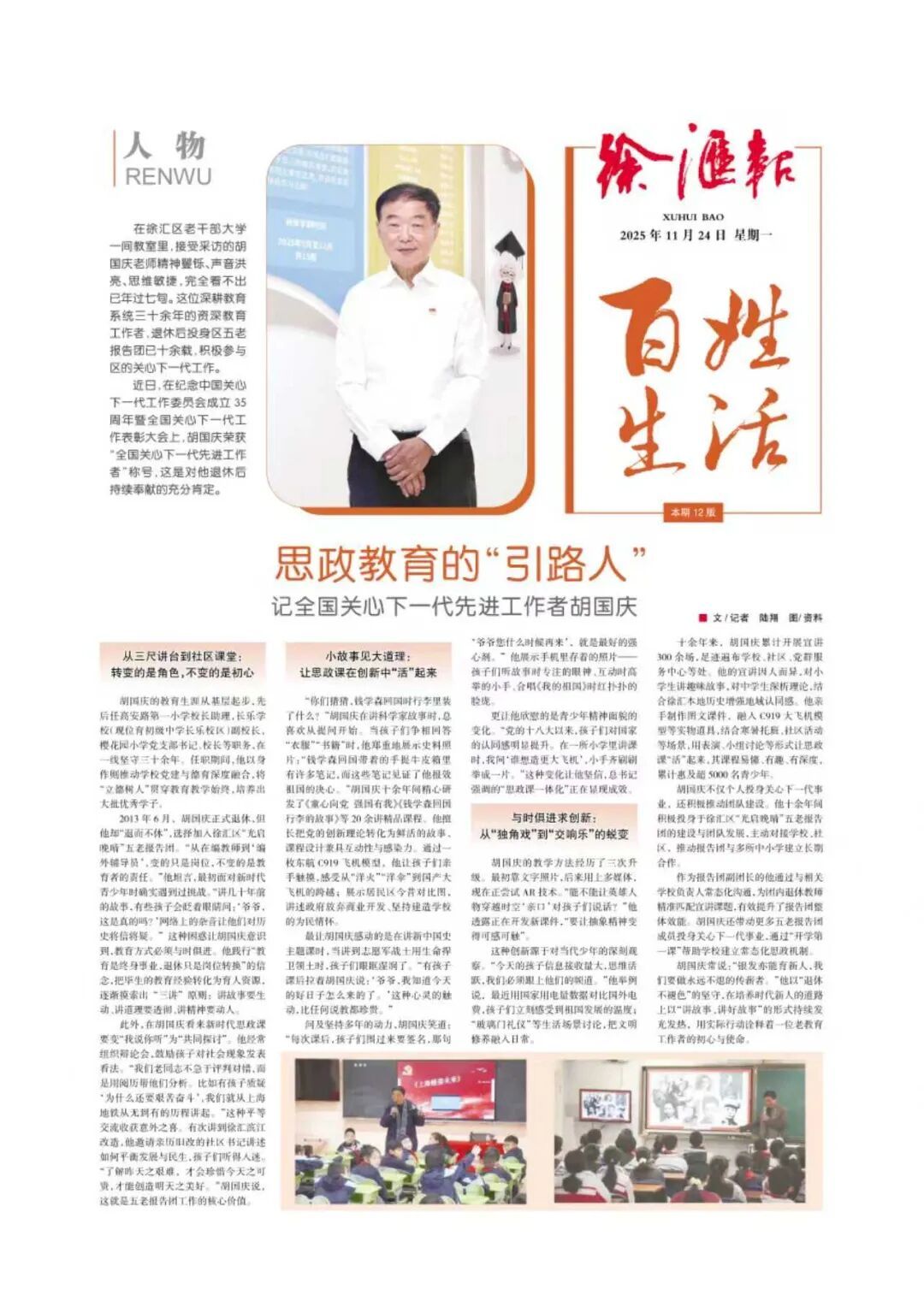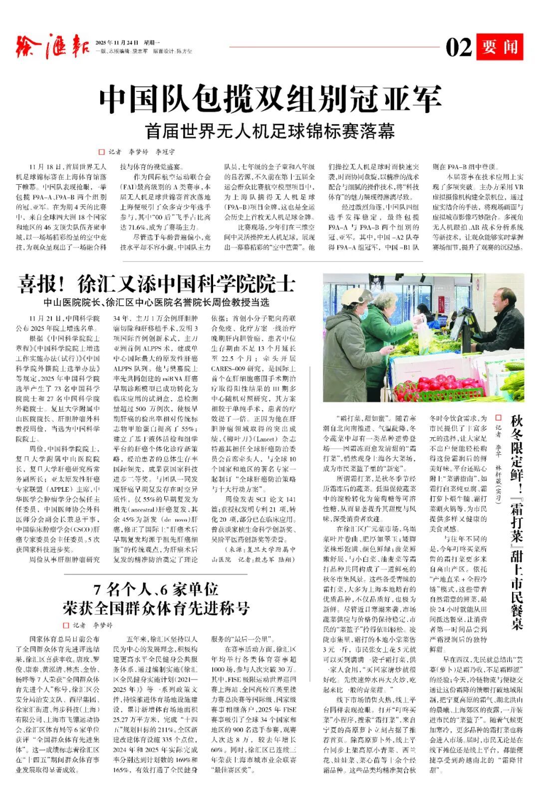 喜报!徐汇又添中国科学院院士 术精于勤,誉满杏坛。复旦大学附属中山医院院长周俭近日当选中国科学院院士,肝胆攻坚34载,书写医者传奇。他主刀手术超万例,其首创的肝癌早期诊断模型将极早期检出率提高55%。他首创小分子靶向药联合免疫、化疗方案,为晚期肝内胆管癌患者延长生存期;他受邀牵头制定“全球肝癌防治策略与十大行动方案”,彰显我国肝胆肿瘤领域的国际引领地位。 理论大宣讲“声入人心” 徐汇区“思享大学堂”第三季理论大宣讲正式启动,以三大创新推动党的理论“声入人心”。一是“按需点单”精准赋能,实现区校合作课程直达基层;二是数据驱动课程设计,通过调研,推动内容向“要什么、讲什么”转变;三是促进单向传播转向精神共鸣,通过青年微宣讲与专家解读相结合,让创新理论“飞入寻常百姓家”。这一系列举措生动展现了新时代理论传播的徐汇智慧与群众路径。 思政教育的“引路人” 胡国庆近日荣获“全国关心下一代先进工作者”称号。三尺讲台三十载,立德树人守初心;退而不休献余热,“光启晚晴”砥砺行。小故事中见道理,思辨互动事事明;实物模型启心智,精神育苗求共鸣;AR技术润无声,与时俱进又萌新;惠泽五千青少年,“独角戏”成“交响音”。他坚信:银发亦能育新人,要做不熄传薪者。 湖南街道综治中心焕新开放 湖南街道综治中心焕新开放。它以温暖守护编织社区平安网络。这里构建起了“专职调解员+民警+律师”的三级治理网格,用专业力量筑牢安全防线。“三所联动”机制实现了矛盾一站式化解,智能化服务让关怀精准直达。法治宣传如春风化雨,让安全感与幸福感在社区落地生根。 徐汇秋韵向上而生 徐汇的秋,是梧桐叶脉间流淌的金色时光,每一片落叶的斑驳都写着岁月沉淀的从容。徐家汇的红叶在枝头绽放希冀,古银杏将六百年伫立凝成对大地的守望。西岸的风掠过工业遗存与科技新枝,在江岸织就一幅传统与未来交融的斑斓长卷。这满城秋光不诉愁绪,只以沉静而炽烈的姿态,邀我们流于时光,共酿徐汇秋韵,在生命四季里始终向上生长……