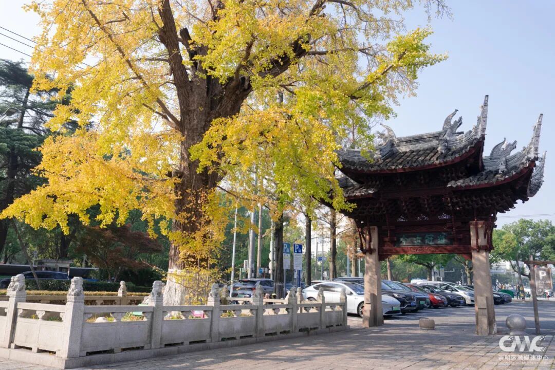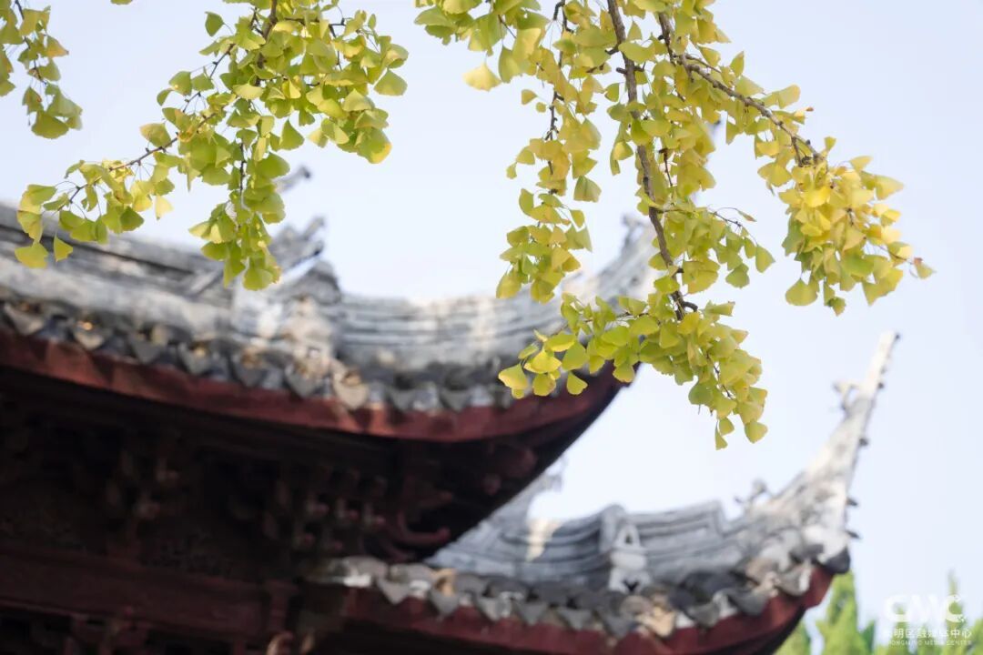 而崇明学宫门口的两棵古银杏树,更是秋日里的“明星”。据了解,这两棵银杏树已有数百年树龄,树干粗壮挺拔,枝繁叶茂。阳光直射下,树顶的叶片宛如镀上一层明亮金箔,熠熠生辉,将学宫映衬得愈发古朴雅致。