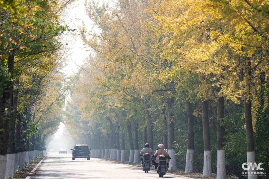 沿着长征公路行驶,两侧的银杏树已悄然换上 “金装”,层层叠叠的金黄在风中舒展,尽显崇明秋日的浓情。阳光透过枝叶的缝隙温柔洒落,在路面织就出斑驳灵动的光影,随车轮缓缓流动。