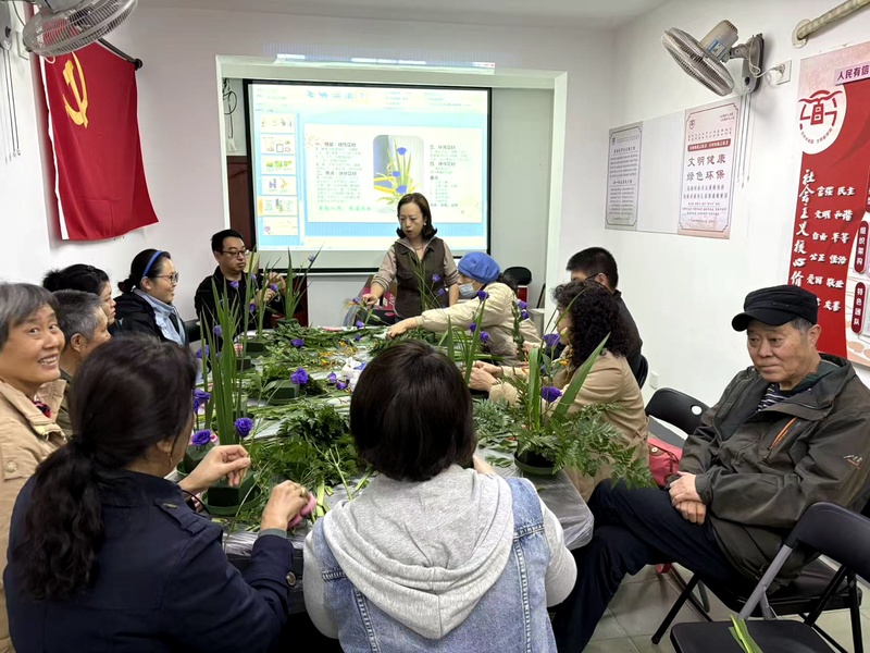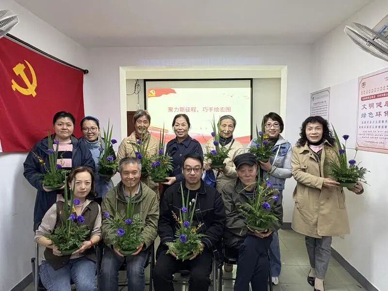 会后,一场诗意盎然的中式插花体验将活动推向高潮。高级花艺师周琰老师以“梅兰竹菊”四君子为引,讲解传统插花艺术中的“天人合一”美学理念。在老师指导下,参与者们巧手扦插、精心布局,创作出兼具古典韵味与现代审美的花艺作品。这些作品不仅装点了社区活动室,更成为凝聚共识的“文明载体”——每一朵花都象征着不同群体的携手同心,每一枝叶都诉说着共建美好家园的殷切期盼。
