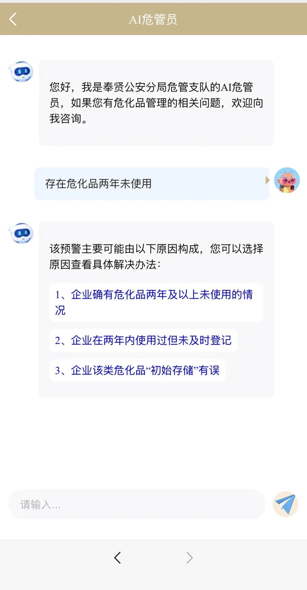 在企业云端,奉贤旗舰店新增上线“AI危管员”“贤址云”“奉贤区市场监管领域综合治理数字化平台”等重点应用。以“AI危管员”为例,该应用服务依托人工智能、物联网和大数据技术的智能化风险管理平台,为企业提供危化企业管理智能服务。该功能主要包含四大核心模块:预警查询功能支持企业用户实时查看企业预警信息;AI咨询服务可解答危险管理相关的政策法规和办事指南;预警反馈模块协助企业获取安全检查单,针对发现问题进行整改后向公安部门提交整改情况;预警指导功能则通过智能预警模型,为企业提供消除预警的具体途径和措施建议,有效提升危化企业管理的预见性和时效性。