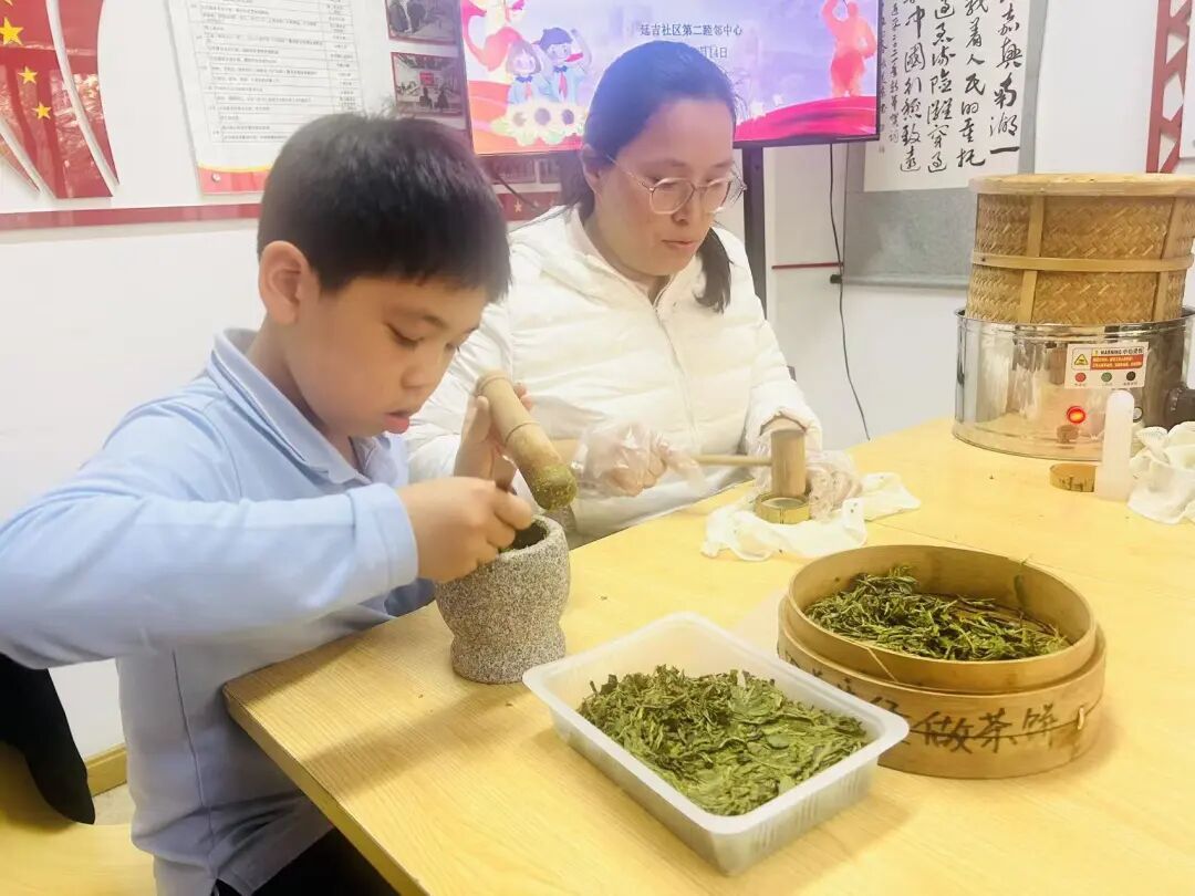 “蒸之、捣之、拍之……”延吉社区第二睦邻中心里,一幕“梦回唐朝”的制茶场景正生动上演。没有教科书,没有PPT,国家级茶艺技师王敏手把手地教孩子们复原“茶圣”陆羽在《茶经》中记载的唐代制茶法。