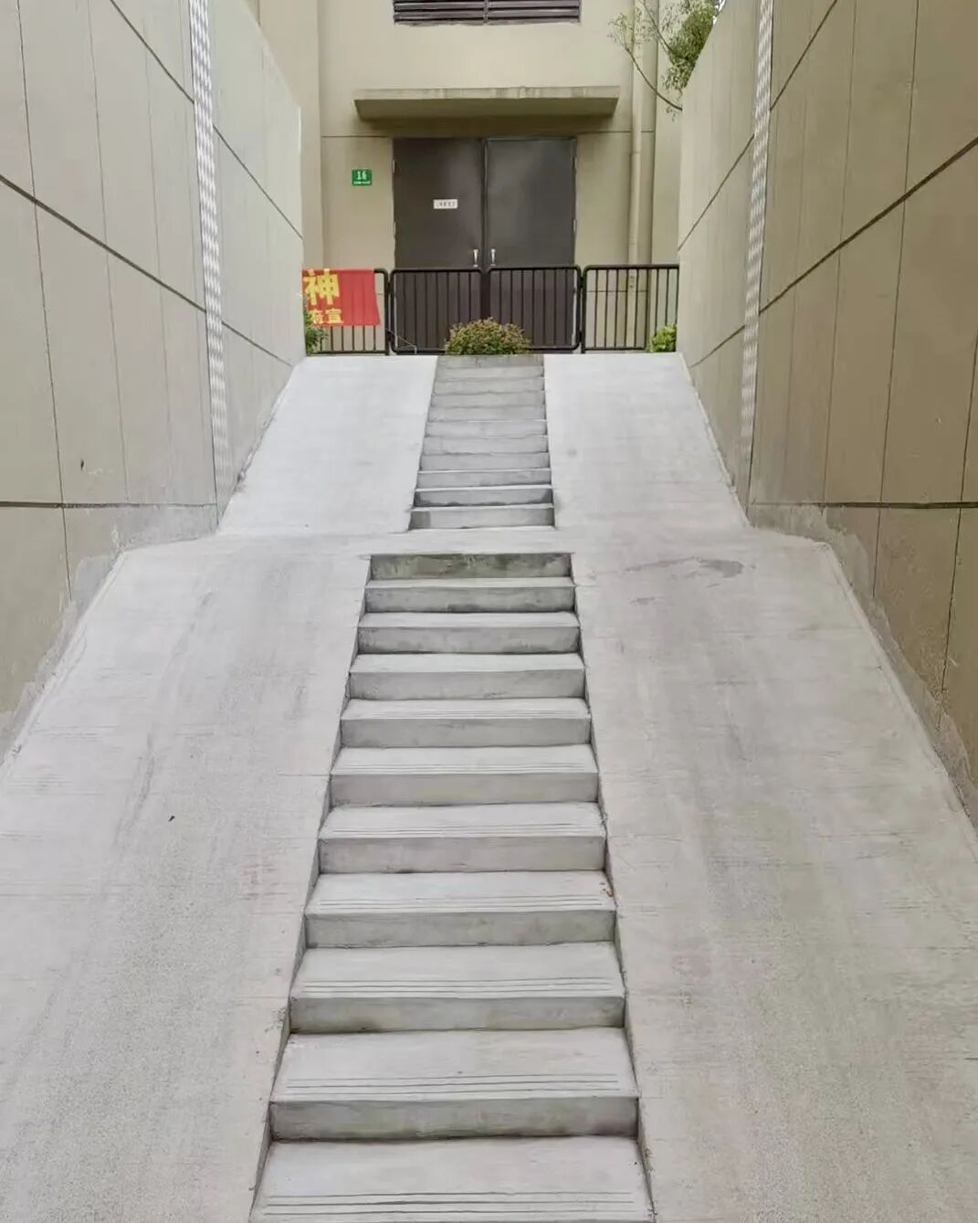改造后,中间步梯间距从117厘米压缩至60厘米,推行路线更顺畅;两侧坡道由50厘米拓宽至76-77厘米,满足双向通行需求;创新设置2厘米宽双侧排水渠,快速排走雨水,从源头解决湿滑问题。
