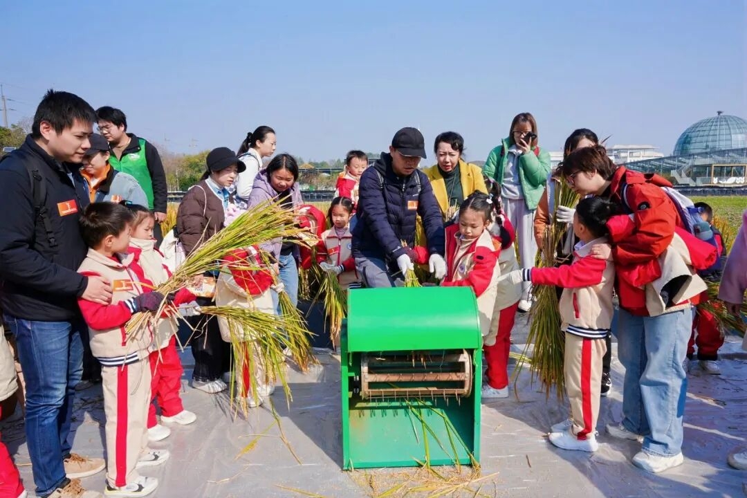 在田间地头,孩子们触摸到金黄的稻谷。他们不仅学习了稻作文化的历史,还在老师的指导下,亲手体验了从稻谷脱壳到变成洁白大米的完整过程,深刻体会到了“一粥一饭”的来之不易。一(6)班姜梦然家长说,孩子从不会到跟着学,攥着稻秆搓谷粒,虽然弄得满手是谷糠,却越干越起劲。她不仅体验到了劳动的乐趣,还真切懂得了粮食来之不易,知道了劳动能创造价值。
