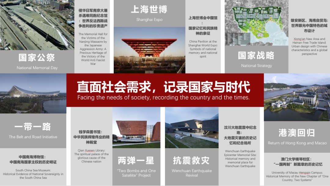 伟大时代里面必然出现一些有影响的、非常重要的建筑,永久保留作为历史的见证。何镜堂团队负责了一大批带有时代印记的建筑的设计:作为国家记忆和民族精神的象征的上海世博会中国馆;作为世界反法西斯战争胜利的珍贵遗产的侵华日军南京大屠杀遇难同胞纪念馆;作为“一国两制”新篇章的历史记忆的澳门大学横琴校区;作为中华民族辉煌伟业的精神殿堂的上海交通大学钱学森图书馆;作为中国南海国家主权的历史明证的中国南海博物馆;作为大地震灾害的历史记忆和纪念场所的汶川大地震震中纪念地;让世界看到中国特色的国家战略如河南雄新区启动区城市设计、海口—自贸港核心区总体城市设计……