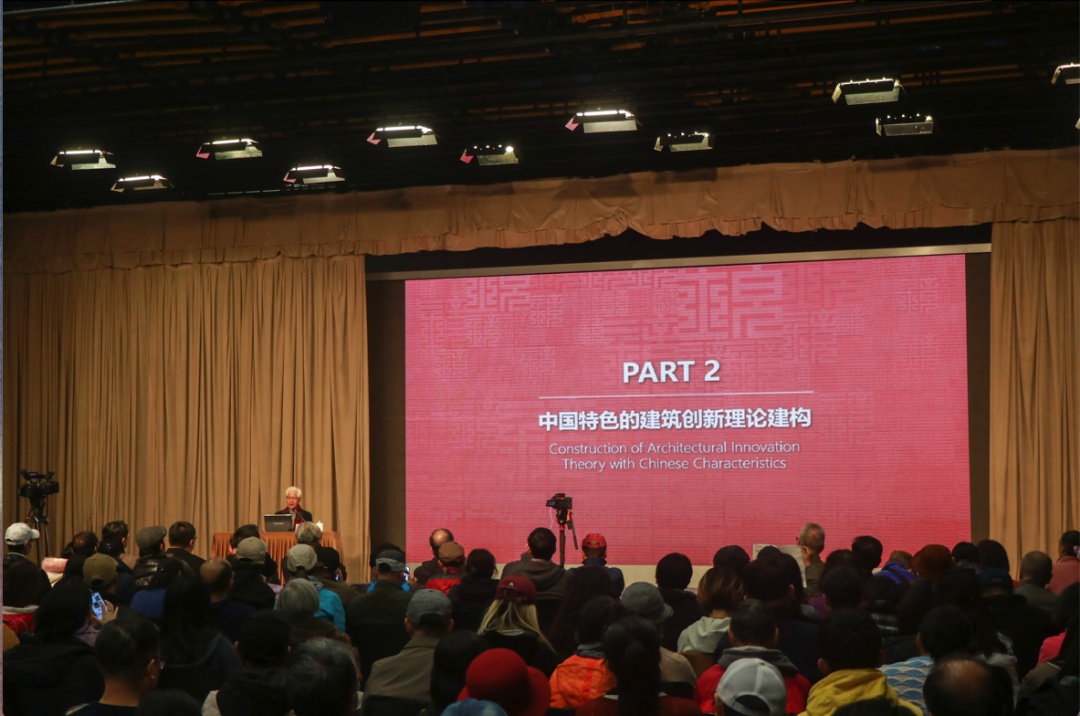 何镜堂的演讲课题为“建筑视角下的地域·文化·时代——为高质量发展的中国而设计”。他向听众介绍了包含上海世博会中国馆、白鹅潭大湾区艺术中心、中国国家版本馆(广州馆)等多个公共文化建筑案例,阐述他在长期实践中树立的“两观三性”建筑论,即建筑要有整体观和可持续发展观,建筑创作要体现地域性、文化性、时代性的和谐统一。他阐述了自己如何以建筑记录时代,面向国家与时代需求,创作了一大批具有国际影响力的标志性建筑,走出了一条自主创新的发展道路,为高质量发展的中国而设计。