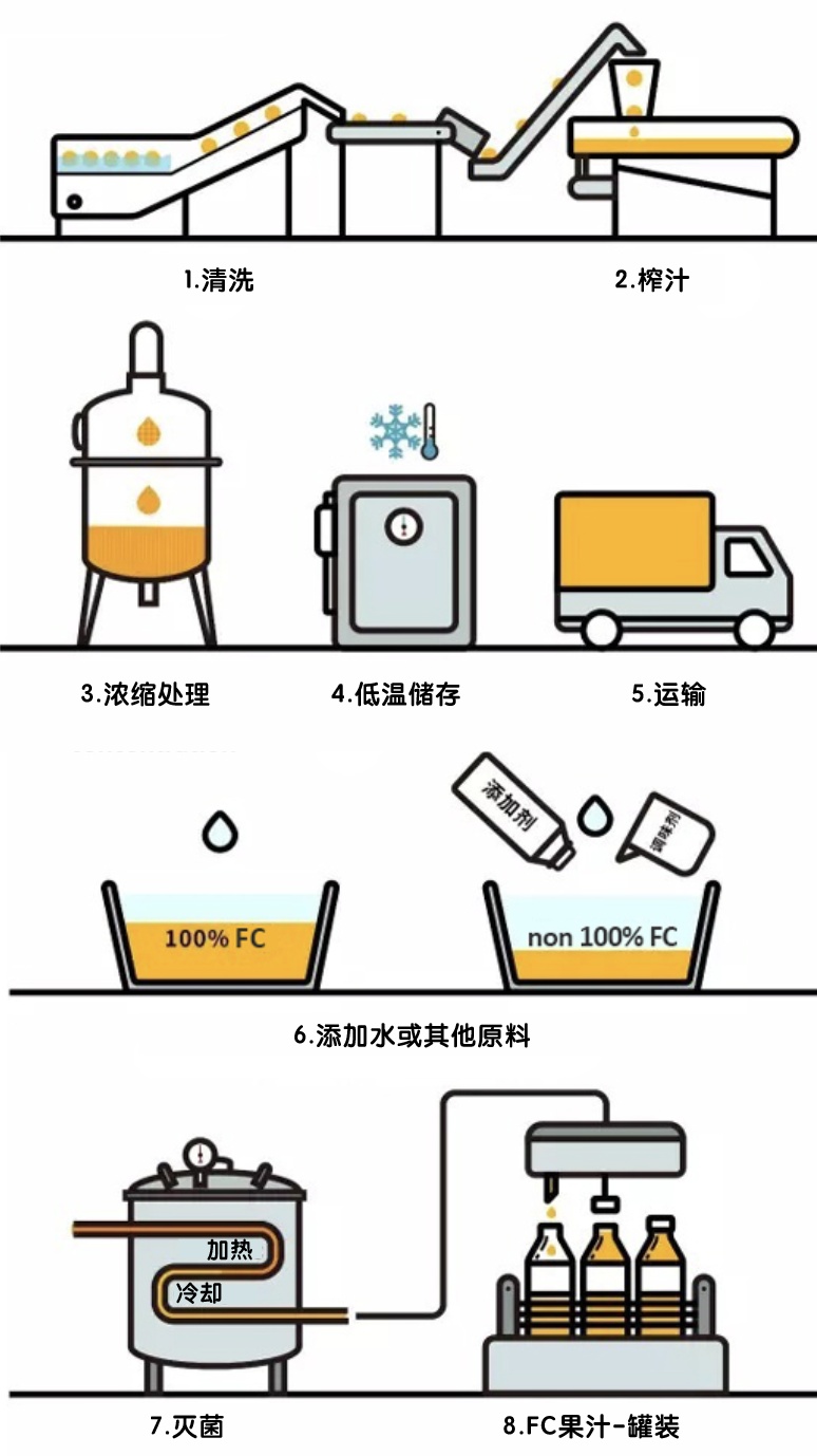 FC(From Concentrate)果汁为复原果汁,是在浓缩果汁中加入一定量水分复原而成的制品。由于经过浓缩与还原的复杂加工,其营养成分及口感不及NFC果汁。