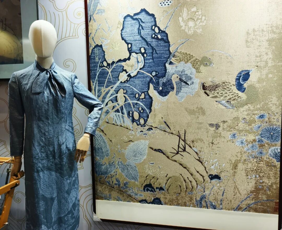 再创作出的这幅提花作品,既传承了朱克柔精心织造的生趣盎然的花鸟画境,也在此基础上加以技艺革新,以松江传统提花技艺和数字孪生技术为缂丝工艺的现代化表达注入汩汩生机。除了这幅长达五米的巨作挂毯,上海鼎天提花博物馆团队还以此为基础展开应用创作,通过提花技艺将《莲塘乳鸭图》等经典织成高定面料,创作出典雅而精美的时装,让传承千年的宋代缂丝以崭新的面貌融入当代人的日常生活。