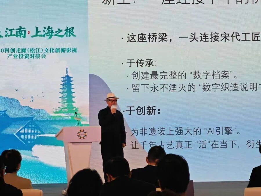 上海鼎天提花博物馆馆长柴方军现场介绍《莲塘乳鸭图》创新工艺