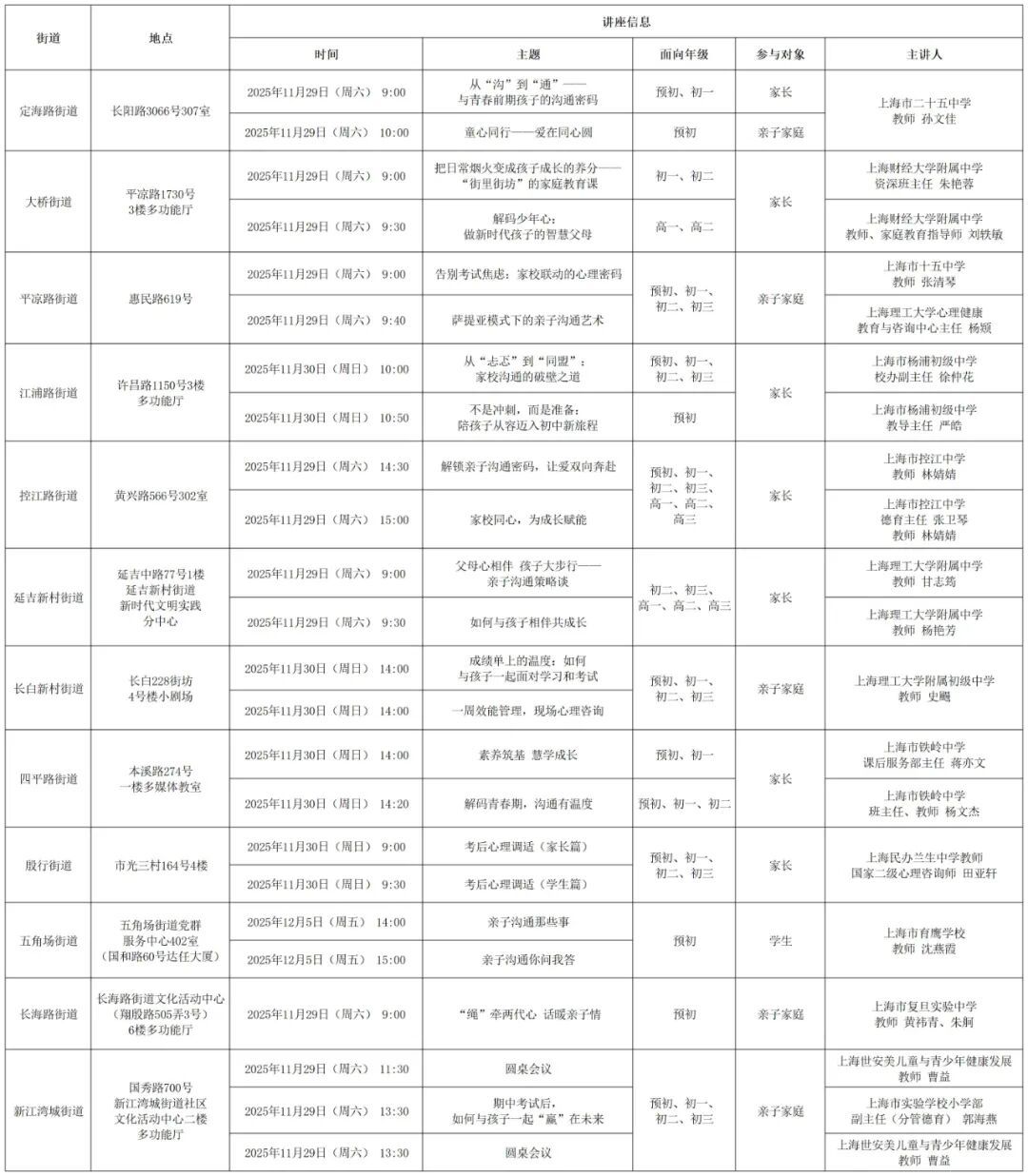 # 转眼学期过半,您和孩子是否正被莫名的焦虑和压力所袭扰?为切实回应广大家长与学生的现实需求,构建家校社协同育人的良好生态,区教育局以学校为圆心、以区域为主体、以资源为纽带,联动各委办局,立足12个街道,整合各类育人主体与资源,为杨浦亲子家庭带来“YOUNG陪伴·慧成长”家校社协同育人“教联体”成长护航专题活动——“陪伴呵护,智慧成长”。 这一次,区教育局携手各街道将专业教育资源直接送到杨浦亲子家庭身边,让杨浦教育的温情与专业,陪伴每一个家庭平稳度过学生成长关键期。 活动以“微讲座+个性化咨询”为载体,旨在通过专业引导与资源联动,帮助家长与学生科学认知和疏导学业焦虑,面对学业关键期掌握科学的学习、规划与管理方法,共同塑造健康积极的成长心态。让我们走入家庭、走出校园、走进街区,用心陪伴,用爱呵护,护航青少年智慧成长。 社会报名正式开启 快来PICK你心仪的讲座! (请点击“阅读原文”扫码报名) ↓↓↓ (可点击查看大图) 我们在这里, 期待与您携手, 用陪伴与呵护浇灌成长的沃土, 静待每一株“智慧新苗” 茁壮成长。 1 温馨提示 1.您可按需参与活动,每场活动限10个名额,请点击“阅读原文”扫码报名。 2.名额报满将关闭报名链接。若报名成功,工作人员将与您电话联系进行确认,活动当天凭预约短信参与。 3.活动请务必注意安全,听从现场工作人员安排。 *报名请点击左下角“阅读原文”↓