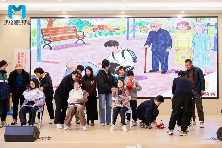 原来,颛桥镇当天还在北桥中学举行了一场急救技能联赛决赛,来自五大片区的 10 支队伍同台竞技,涵盖未成年、成年、老年、家庭四大组别,不同年龄、不同身份的 “生命守护者” 们,用专业操作与沉着应变,上演了一场 “与时间赛跑” 的急救比拼。