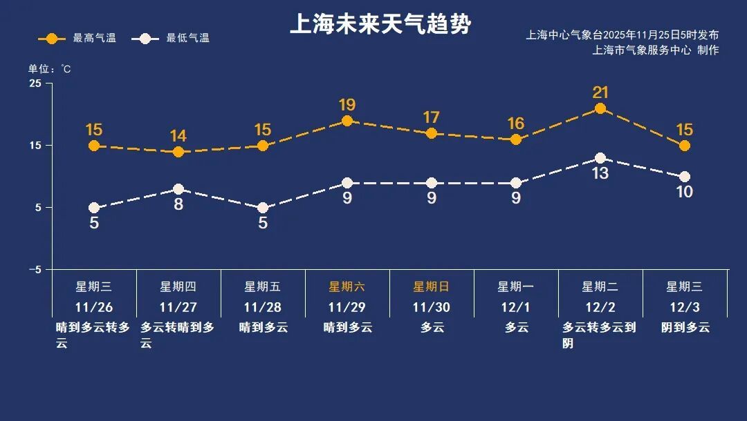 受辐射降温影响,明天早晨气温为近期低点,预计中心城区最低气温在5℃左右,郊区在0~3℃之间,局部地区有薄冰。白天略有回暖,最高气温在15℃。周四前后还将有新一股冷的空气影响申城,届时又有大风和降温天气。受冷空气打压,周五早晨的最低气温再度降至5℃附近。双休日最高气温又重回17~19℃。本周冷空气接二连三影响上海,气温起起伏伏,请及时调整着装。