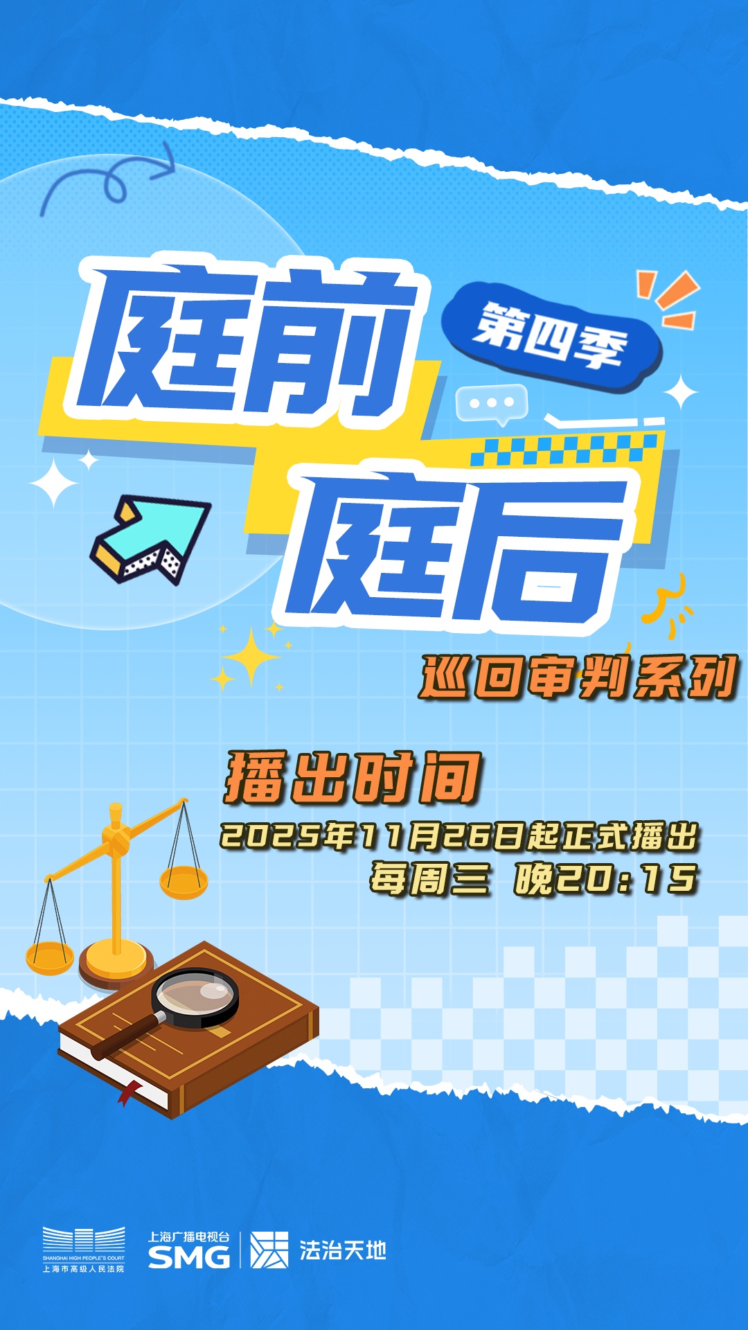 由上海市高级人民法院携手上海广播电视台法治天地频道精心打造的纪实类电视专题栏目《庭前庭后》第四季——巡回审判系列,将于明晚(11月26日)在上海广播电视台法治天地频道开播。届时,上海高院官方视频号、抖音号、快手号、新浪微博、B站也将发布相关视频。