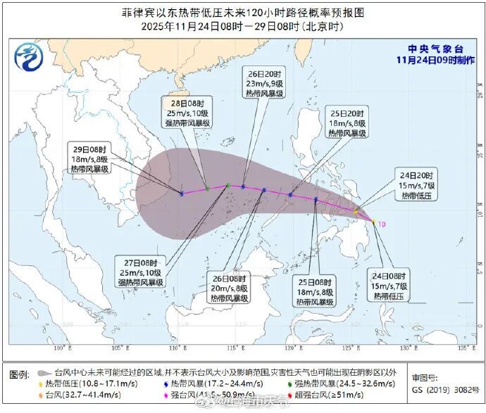据@上海市天气 消息,菲律宾以东热带扰动已于今天上午加强为热带低压,预计该低压可能于未来24小时内加强为今年第27号台风,并于25日夜间进入南海南部海域,强度缓慢加强,最强可达强热带风暴级(25—28米/秒,10级)。