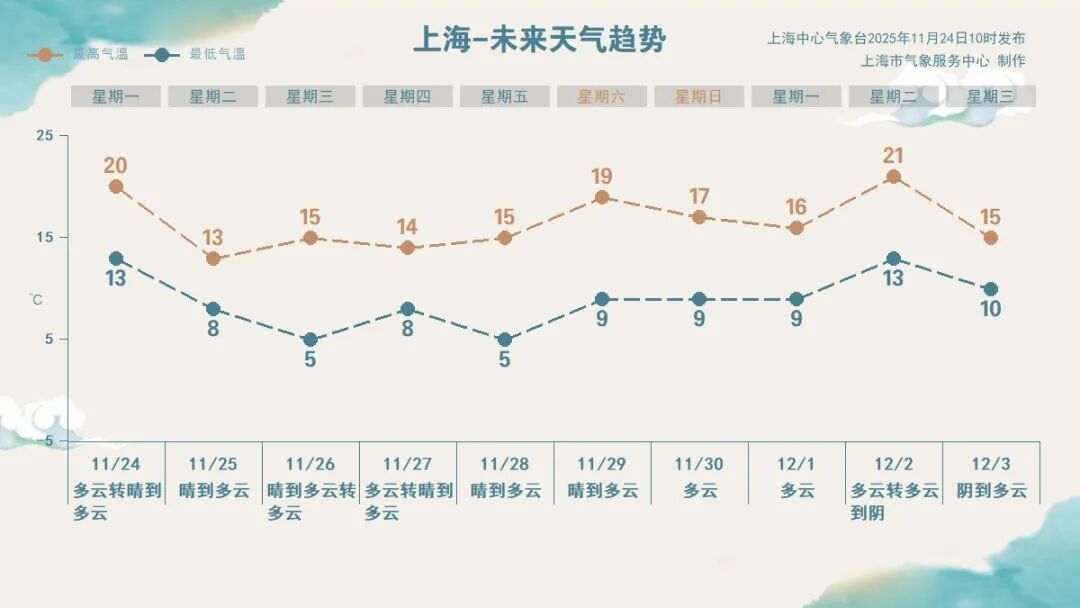 。冷空气到来前,今天白天上海处在暖气团中,最高气温可升至20℃左右。偏西风3~4级,中午起增大至4~5级,相对湿度80%~30%。请注意及时补充水分,注意用火安全。