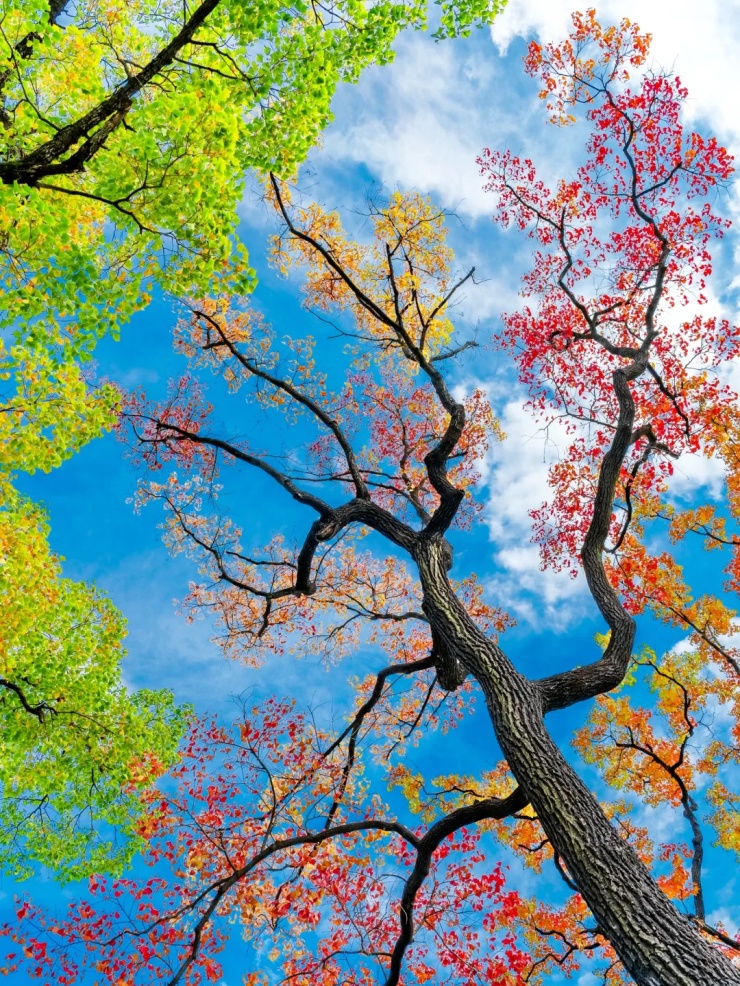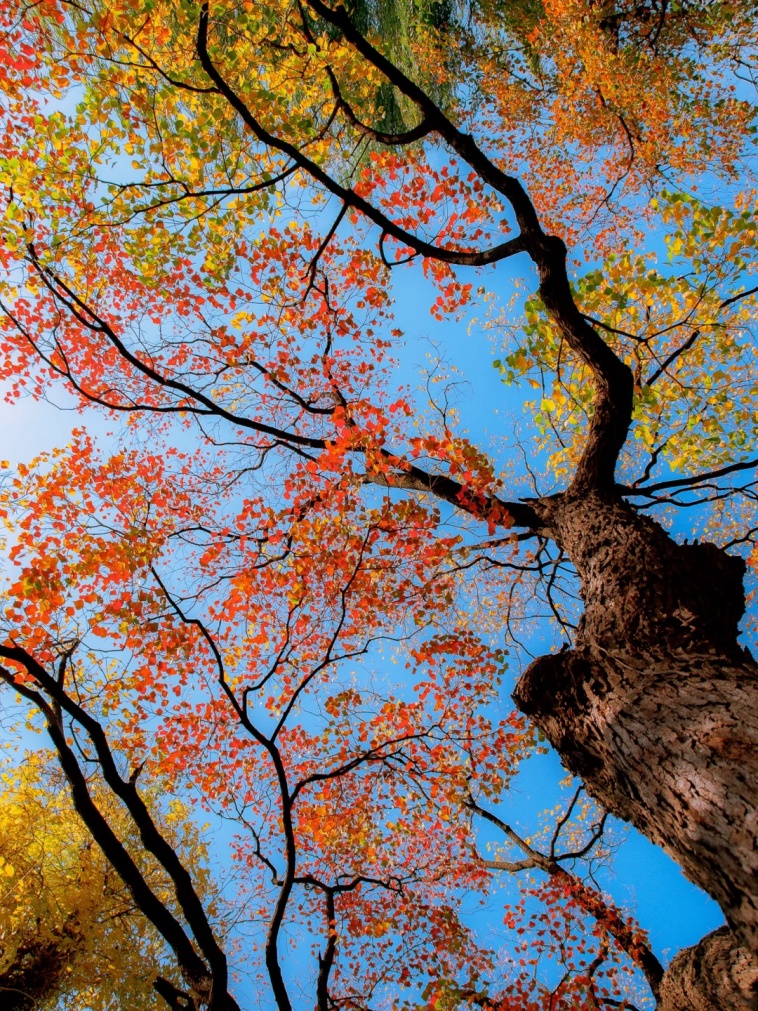 低角度仰拍,树冠与天空构成“秋日穹顶”。