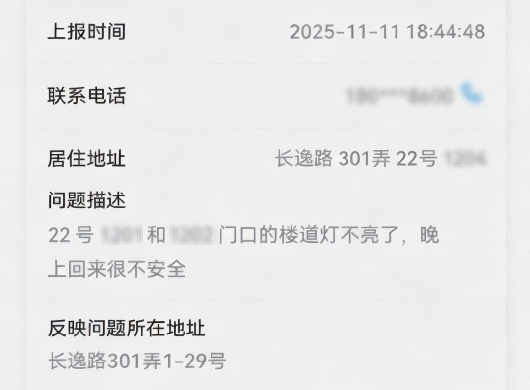 居委接单后,第一时间通过“淞管家”物业服务联合体联动物业并调度维修人员迅速到场。从问题上报到灯具更换,全程不到一小时。依托“淞管家”的协同优势,以“快”为核心,构建起“提交—响应—处置—反馈”的高效服务闭环,成为连接居民与社区的“连心桥”,切实提升了居民的信任感与归属感。