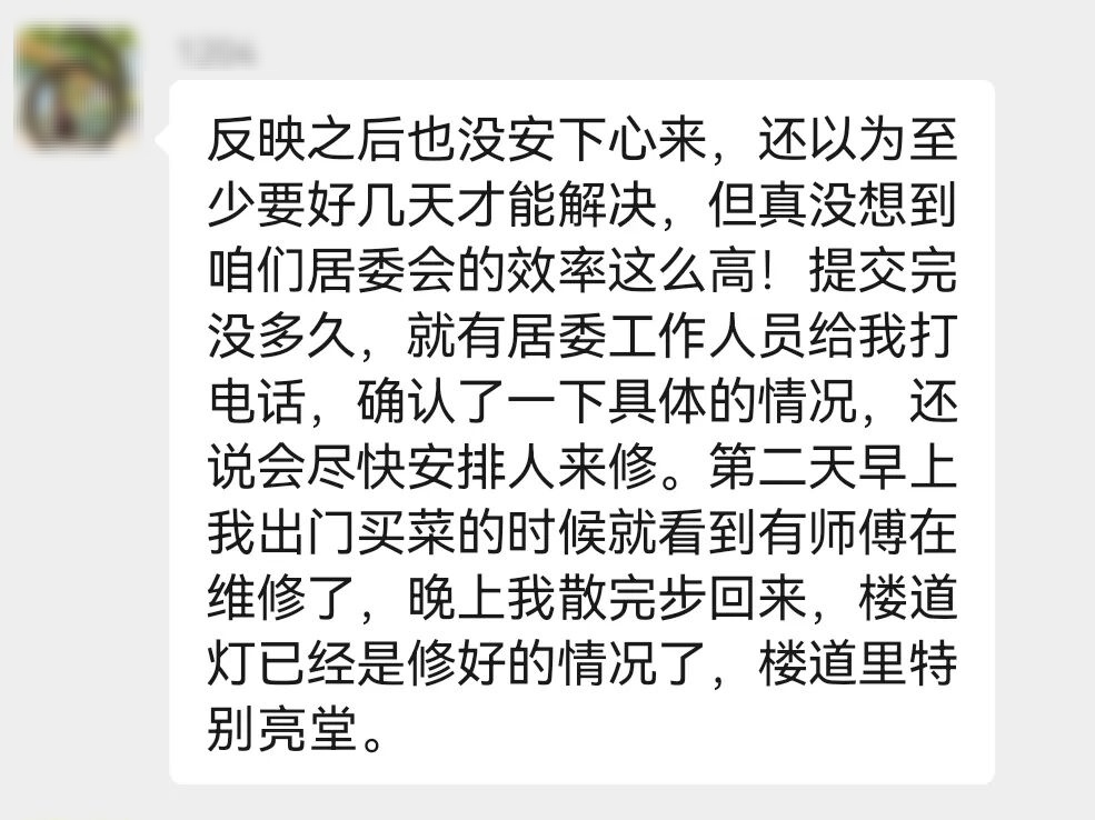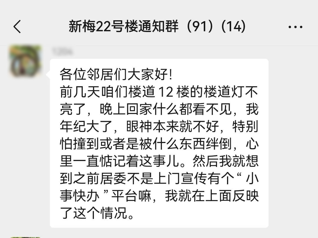 “太感谢居委会了!刚反映楼道灯坏了,这么快就修好了,现在出门特别踏实!”新梅淞南苑22号楼的周阿姨在微信楼道群里连连点赞。原来,她傍晚回家时发现楼道灯损坏,存在安全隐患,便立即通过“小事快办”平台提交了维修诉求。