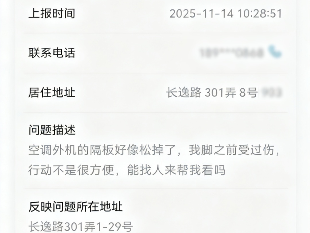 社区8号楼一位行动不便的居民发现家中空调外机隔板松动,存在高空坠物风险,因无法自行处理,遂通过平台求助。居委接报后,立即联动物业与业委会上门核查,结合居民实际情况,量身定制加固方案,迅速完成修复。