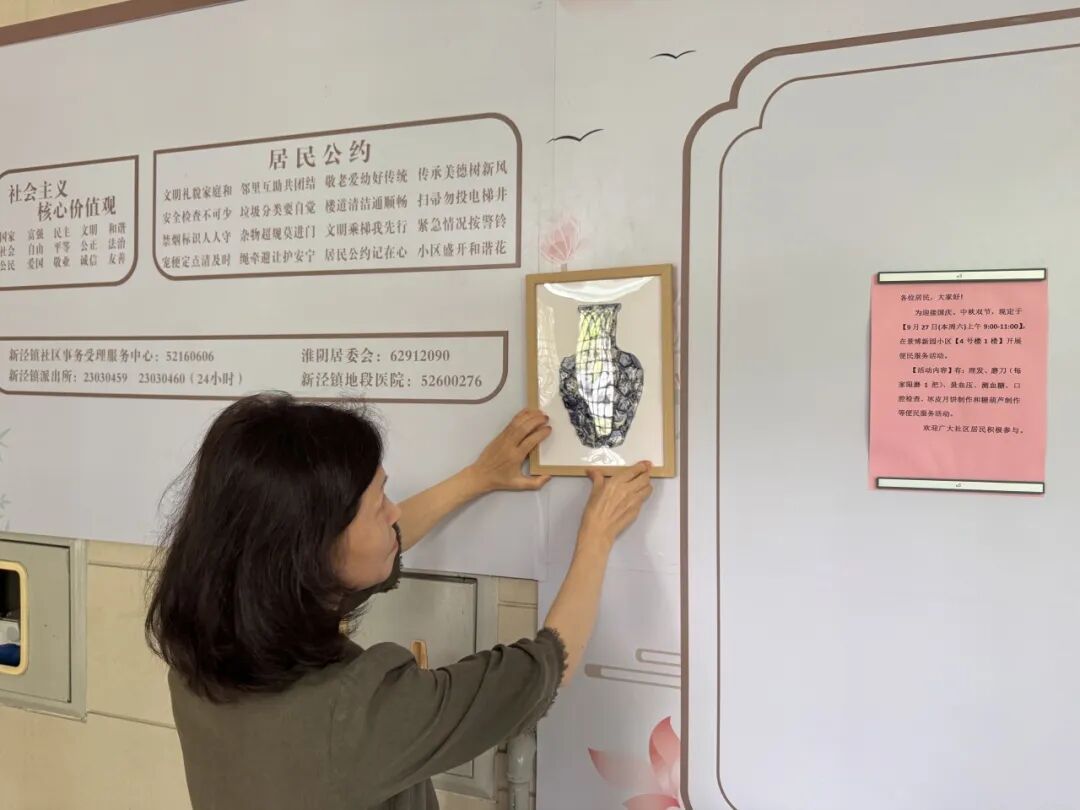 改造过程中,居民不仅是建议者,更是参与者。通过多场手工活动,大家亲手制作青花瓷盘装饰画等作品,以磁吸或可撕换的形式悬挂于楼道里,既美观又便于后期更新。“这些装饰带着邻居们的温度,让楼道变成了有故事的‘文化墙’。”居民区工作人员介绍道。