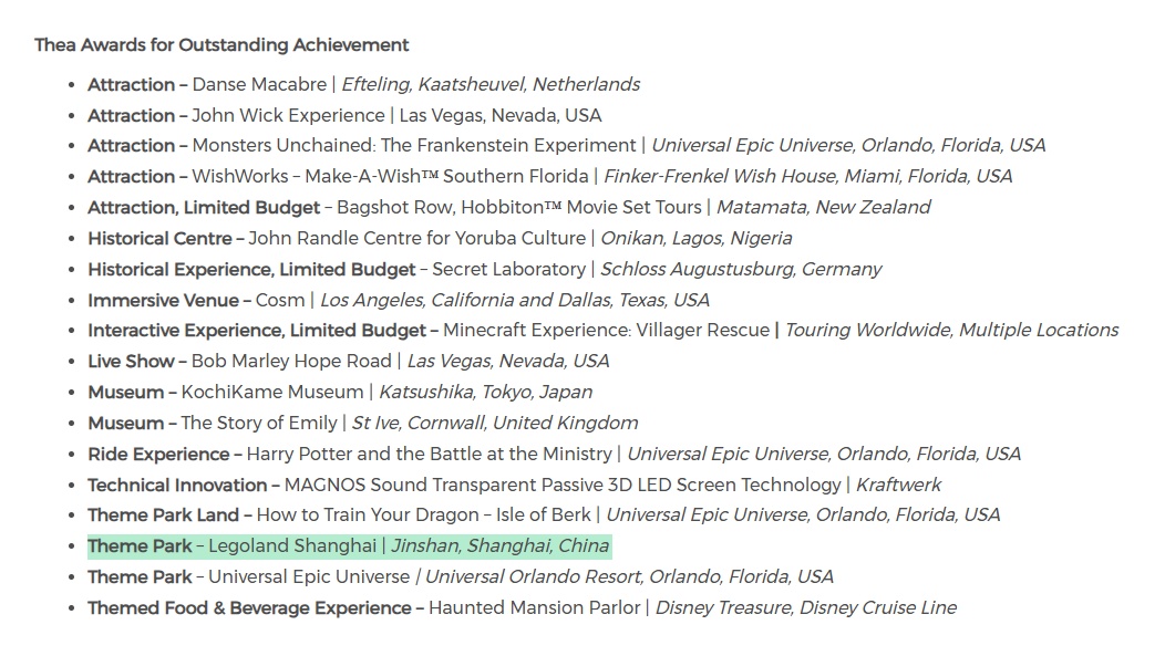 日前,全球主题娱乐协会(TEA)公布第32届“西娅奖”获奖名单。上海乐高乐园获得“主题乐园杰出成就奖”(Thea Award for Outstanding Achievement - Theme Park)。据悉,该奖被誉为主题娱乐行业中最负盛名的荣誉,旨在表彰那些通过其作品展现卓越成就、大胆创新以及提供全球最具沉浸感体验的专业人士和组织。
