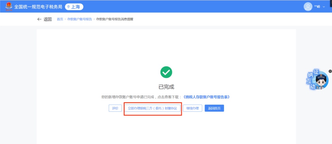 在“存款账户账号报告”界面,选择没有签订三方协议的账户,点击【变更】,修改需要变更的银行账户信息后,点击【提交】,系统显示“已完成”。
