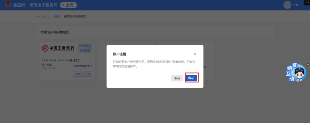 在“存款账户账号报告”页面,依次点击【注销】-【确定】,系统会显示“注销成功”。若是注销的存款账户账号报告信息已签订三方协议,系统将同步终止三方协议。