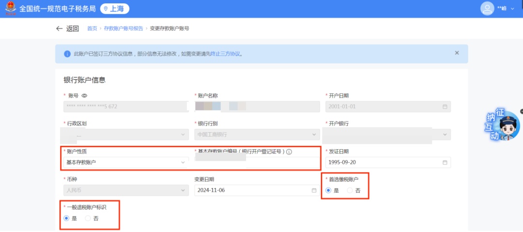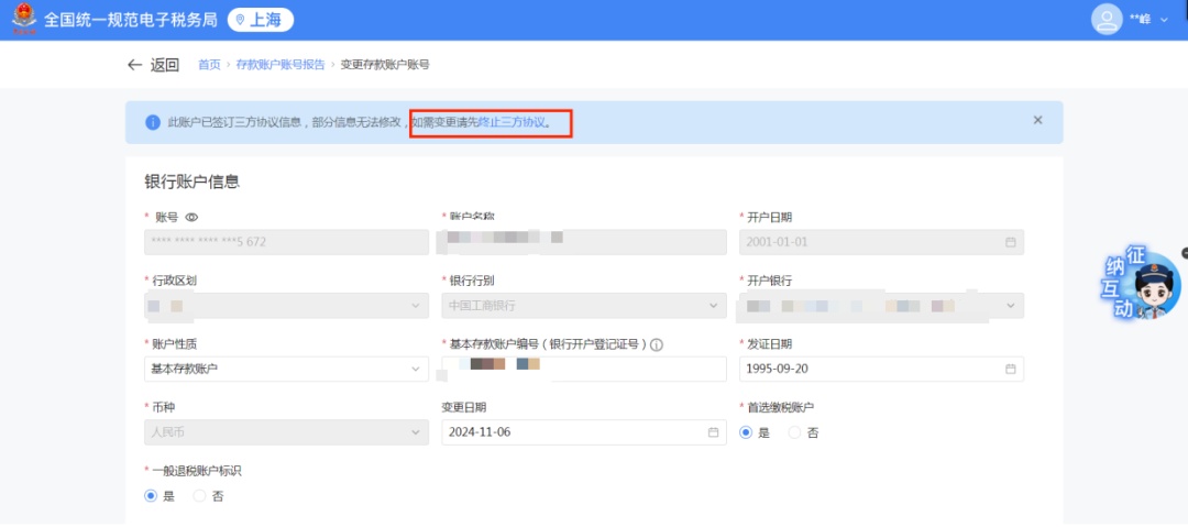 第三步:如果仅变更账户性质、基本存款账户编号、首选缴税账户标识和一般退税账户标识信息,无需终止三方协议,可以直接在变更页面修改,修改完成后【提交】即可。