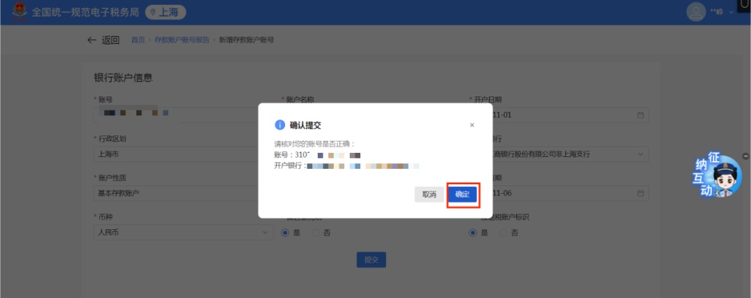 在“存款账户账号报告”界面,点击【新增账户】,正确填写银行账户信息,依次点击【提交】-【确认】,开户银行栏可以输入关键字进行搜索。