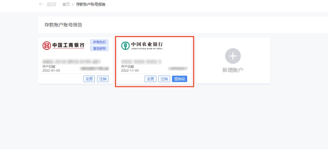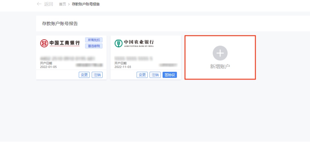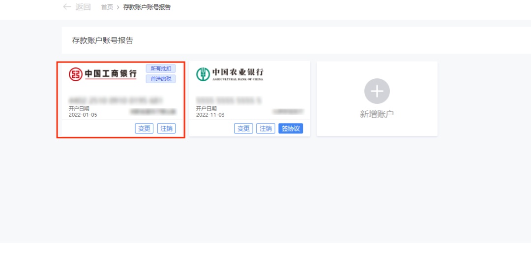 登录电子税务局,依次点击【我要办税】-【综合信息报告】-【存款账户账号报告】,进入功能页面,系统会显示已采集的存款账户信息,可进行新增、变更、注销、签订三方协议等操作。