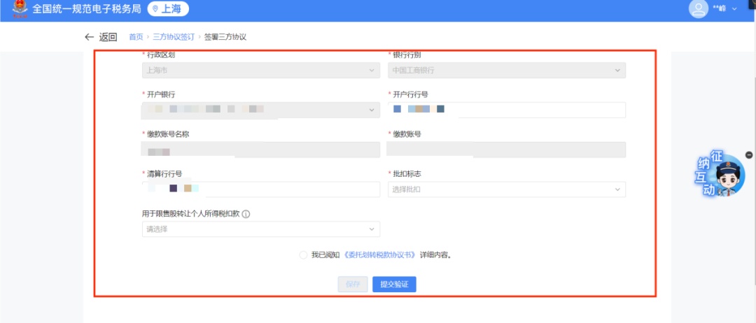 点击【立即办理银税三方(委托)划缴协议】,填写开户银行、缴款账号等关键信息,点击【提交验证】即可签订三方协议。