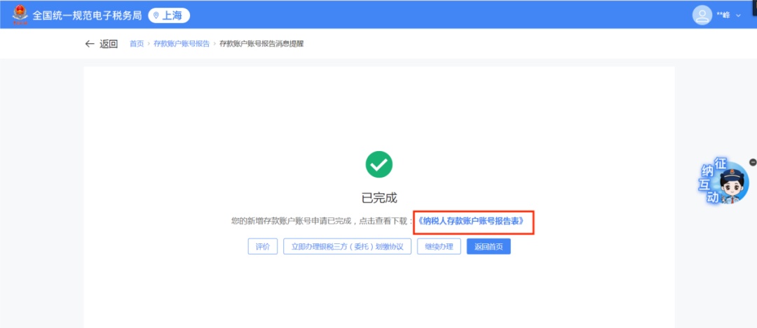 系统显示“已完成”,点击【纳税人存款账户账号报告表】,可下载查看 PDF格式表单。