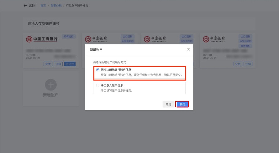 当纳税人为报验户或者跨区税源户登录,进入功能页面点击【新增】时,弹出新增账户框,点击同步注册地账户信息,点击【确定】能获取到注册地主管税务机关报告的银行账号信息。
