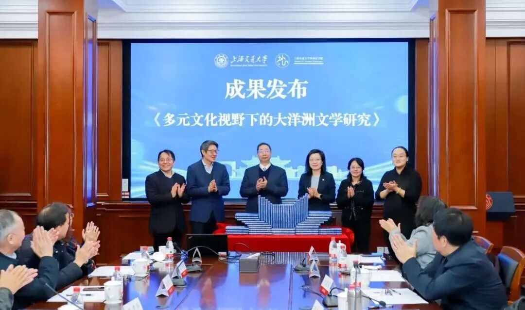 上海交通大学党委副书记、副校长胡薇薇,中国社会科学院学部委员陈众议,广东外语外贸大学云山首席专家张冰,北京大学出版社外语编辑部主任刘文静,上海交通大学外国语学院院长尚必武,上海交通大学区域国别研究院院长彭青龙共同为新书《多元文化视野下的大洋洲文学研究》揭幕。