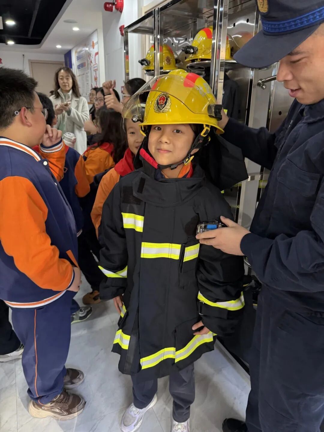 最令人振奋的环节当属消防服快速穿戴演示:几十秒内,消防员便将厚重的消防服、头盔、装备全套穿戴完毕,利落的操作赢得同学们阵阵欢呼与赞叹。