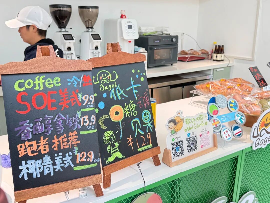 走进“跑者驿站”,跑步主题元素四处可见,墙上挂着满满当当的马拉松奖牌,还有许多跑者在这里留下的照片。在绿色的吧台,可以购买适合跑者的各类饮料和烘焙食品:补充电解质的椰青美式,适合长距离跑的蛋白饮、椰子水,现制的各类0糖贝果,价格也十分亲民,咖啡单价低至9.9元。