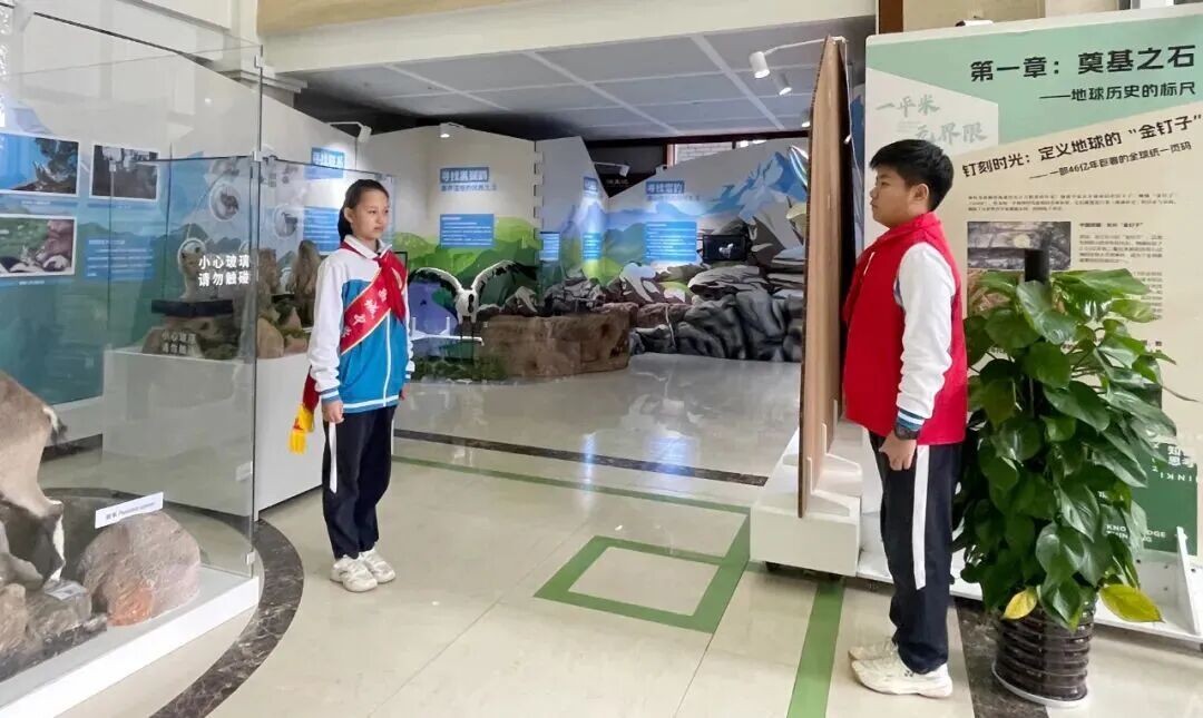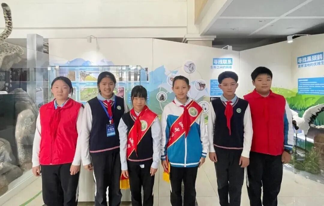 “你们知道黑颈鹤的天敌是谁吗?”七年级小讲解员林清妍正绘声绘色地讲解。德育中心副主任兼大队辅导员张玲丽介绍,三江源主题在校园红领巾广播站和电视台一经播报,立刻成了校园热点!为了让同学们更有参与感和责任感,博物馆设立了一个完整的科创小队。通过自愿报名、投票选举产生。目前有小馆长2名,讲解员4名以及志愿者2名,科创小队实行AB岗轮换制,确保随时能为同学和访客提供讲解服务。